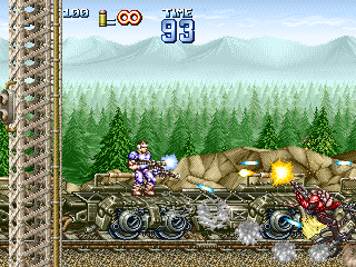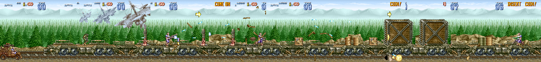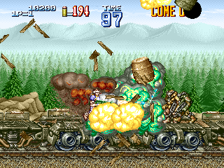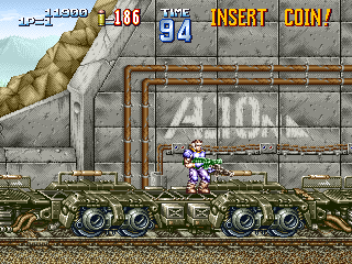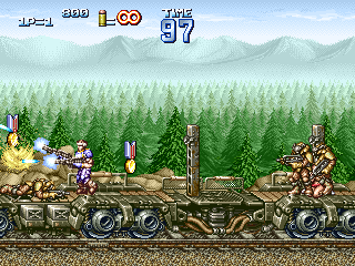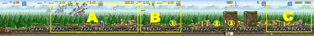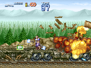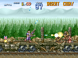 Aポイント:まずはザコ兵士との戦闘! 戦闘列車の最後尾に降り立ったプレイヤーの前に立ちはだかるのは、これから先長いつきあいになるザコ兵士たちの軍団です。 基本的に左右からわらわらと現れ、放置していたら横方向に単発の弾を発砲してきます。 この面は、列車の床に敷き詰められている板を破壊すると、爆発と共に粉々になった床板が画面中を乱舞します。 そのエフェクトで弾が見辛くなることがある上に、貴重な点数源である捕虜が数名とらわれています。捕虜は助けずに放置しておくと一定時間で消えてしまう為、ついつい敵よりも捕虜に集中してしまいがちになります。 ゲームを始めたばかりのところで、流れ弾に当たって死ぬのは相当テンションが下がるので、画面エフェクトにだまされないよう、しっかりと弾を見てよけるようにしましょう。 |