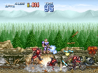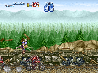 Cポイント:最後はザコとバイクの混成部隊! 途中出現する捕虜を救出しながら先に進むと、スクロールが止まり、ザコ兵士とバイク兵士が立て続けに出現します。 |