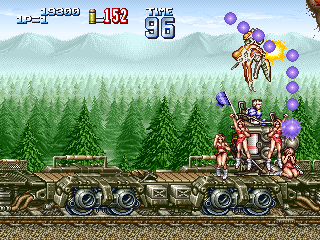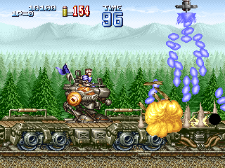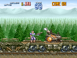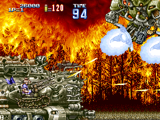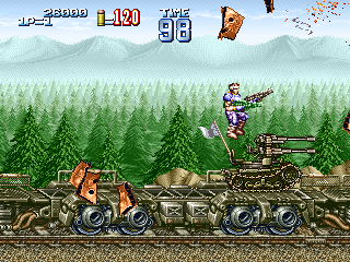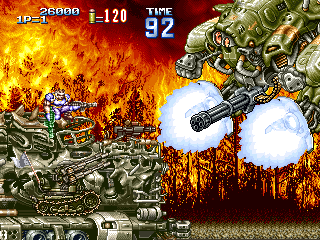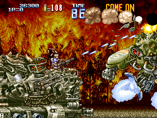 戦車 防御性能:一定攻撃のみ防御不能 耐久性能:高い 耐用時間:入手後、ステージ終了まで 1面ボス直前で入手できる攻撃性能の高い戦車。耐久性能も高く、1面ボス打倒には必要不可欠な必殺兵器と言えるでしょう。 攻撃方法は砲門から放たれるバルカンで、連射性能も高く威力もあります。 ただし、1面ボスのガトリング砲(生身のプレイヤーには影響せず、乗り物や背景全般に大ダメージを与える攻撃)や、火炎放射器には弱く、あっという間に破壊されてしまいます。そのため、その攻撃が始まったら一度戦車から降りる必要があります。 また、ほぼ全ての攻撃に対して、搭乗者であるプレイヤーを保護してくれるのですが、1面ボス最後の攻撃である、手づかみミサイルに対しては全くの無力であり、戦車に搭乗しているとフットワークに欠けるため、確実に殺されてしまいますので注意しましょう。 |