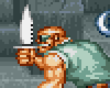 1200・400 | あらゆるザコ敵の中でも、要注意優先度が非常に高い、うっとおしいキャラの代表選手です。 主な攻撃方法は、手持ちのナイフを投げる、ナイフで斬りつける、主人公達のようにローリングしながらしのびより、ナイフで斬りつける、といったもので、どの攻撃も一見大したことの無いように見えるのですが、このキャラのうっとおしい所は、その知能犯的な、頭脳の良さにあります。多数の戦闘時には、常に主人公の背後もしくは、中間距離に位置し、他のキャラに注意を奪われている間に、背後からのナイフ投げや、絶妙な位置からのダッシュ攻撃、ナイフの一振り等によって、主人公の体力を奪い、隙の出来た主人公は、さらに他の敵から袋叩きにされる事もしばしばです。 こいつや後述するパンク系の敵がいる時は、真っ先に攻撃対象に入れるように心がけましょう。止めをさすと、ナイフを落とします。 |
