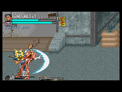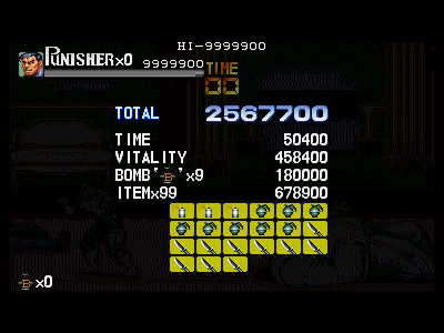 全てにおいて、完璧であろうプレイを行った場合の理論値ですが、パニッシャー使用で約1070万点、ニック使用で約1090万点となると思われます。この理論値は、全面体力パーフェクト、手榴弾未使用、ほぼ全敵に効果的な攻撃を命中させた場合を想定したスコアです(ひょっとしたら、もう少し高いかもしれませんが)。この理論値から、どの辺りを落としても、カンストが達成し得るかを考えながら、プレイを煮詰めて行って下さい。なお、さらに詳しいカンストを考慮に入れた攻略は、別項を設ける形で、各面の攻略に加えていきます。