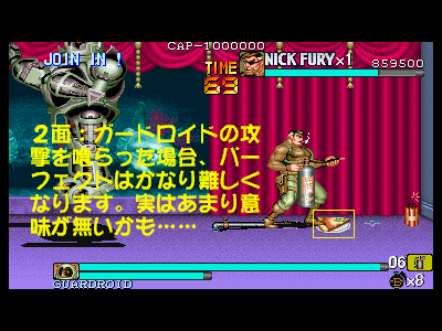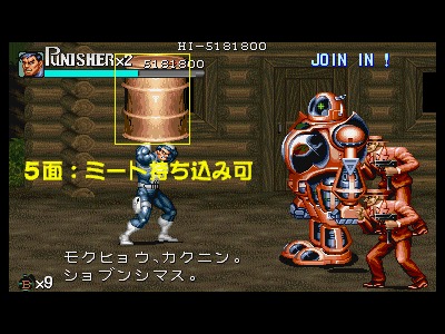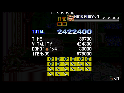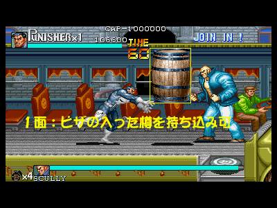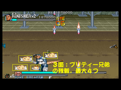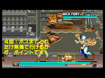 その3:体力ボーナス等の各種ボーナスを逃さない このゲームは、全てのステージで、ボスとの戦闘時になんらかの食料を残して戦うことが可能となっています(1面はピザ、2面はチーズかスライスピザ、3面はプリティー兄弟が落とす食料4つ、4、5、6面はミート(但し、最終面は相当持っていくのが大変です))。各面クリアの際に、体力が満タンであった場合、その時の残り人数に合わせたパーフェクトボーナス(初期状態で体力ボーナス含めて約13万点、残り人数2人で約20万点、最終面のみ、残り人数1人あたり20万点入るので、最大で60万点)が入ります。パーフェクトボーナスは、当然体力が満タンでなければ、ただの体力点のみになってしまうため、天と地程の差がついてしまいます。 また、前述した通り、残り人数によってもパーフェクトボーナスは変動します。プレイがほぼ完璧であった場合、3面ボス、もしくは3面ボス直前道中で、エクステンド点である180万点に到達する可能性があり、そうなった場合は、3面クリア時から20万点のパーフェクトボーナスが入る可能性が出てきます。 カンストを目指した場合、このボーナスを落とす事が許されるのは、大体2回まで(安定しないのは、3、4、6面。特に6面)となっており、比較的安定する1、2、5面でボーナスを逃してしまうと、カンスト達成はほぼ絶望的になります。 その他のクリアボーナスとしては、手榴弾の所持数もそれなりに重要(特に最終面)な要素となっており(1〜5面までが1つ5000点、最高45000点、最終面のみ、1つ20000点、最高18万点)、極力手榴弾を使わないという事も、高得点の秘訣となっています。ただし、当然の事なのですが、体力パーフェクト点の方が、手榴弾ボーナスよりも高い為、優先度と重要度は明らかに体力ボーナスの方が重要になってきます。 手榴弾を未使用の状態で、体力パーフェクトを狙うのが、比較的困難なステージとして4面(ボスが最も安定しない為。ある意味、ラスボスである、キングピンより厄介です。体力ボーナスを狙った場合ですが……)が挙げられますが、このステージは本当に難しい為、カンストを狙うために、ボスの体力に見切りが付いた時点で、敢えて手榴弾を乱発し、止めを刺すという戦法を利用する事も重要となります。 次に、ボスを倒した時点での時間を換算するタイムボーナスがありますが、タイムオーバーになるかならないかという点の方が遙かに重要なので、あまり考慮に入れなくても良いかと思われます。 クリア時最後のボーナスとしては、アイテムボーナスがありますが、このボーナスは、道中のプレイ結果が反映される事が多い(当然、ボスシーン内でのアイテムを無視する訳にはいきませんが……)のでここでは割愛します。 最終的な結論を言いますと、面クリア時に入るボーナスで重要視する優先順位は パーフェクトボーナス>手榴弾数点>タイムボーナス(アイテムボーナスは、この部分から除外。アイテム点は、道中の行動が重要な為) となります。ボスキャラの戦闘時は、体力の低下に気を配って戦うように心がけましょう。 最後になりましたが、3面終了時のボーナスステージ(樽壊し)は、合計で20個振ってくる樽を、拳銃で破壊していくというものになっており、20個全破壊するとパーフェクトで20万点、弾丸を1発も無駄にしない(20発で破壊する)とスペシャルボーナスとして60万点入ります。カンスト狙いのプレイでは、このスペシャルボーナスがほぼ必須となっています(失敗しても、他の部分をきっちり取っていれば、不可能では無いのですが……)。逆に言えば、かなり楽に60万点ものスコアを手に入れるチャンスです。逃さずにきっちりと取っていくようにしましょう。 |