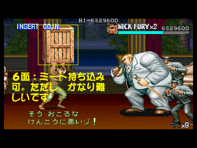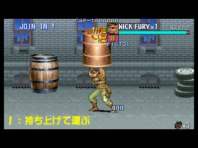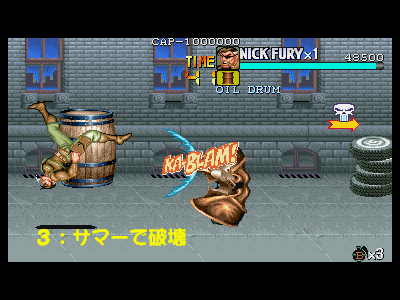 | その2:アイテムボーナスをしっかりと取る このゲームは、各面をクリアする際に、そのステージで入手したアイテムの個数に応じて、ボーナス点が入る仕組みになっており、点数稼ぎをする場合には、使う、使わないという問題ではなく、とりあえず拾っておくという事が、非常に重要になります。 武器類を利用するのが、もし苦手であったとしても、このゲームは比較的簡単に、武器を捨てる事が可能(武器所持時にジャンプ中に攻撃ボタンを押す(ダッシュ中は、流星キックが優先されるので、頂点付近で押さないように注意しましょう))なので、敵が少なくなった時点で、周辺のアイテムや武器を全て回収する事で、比較的簡単に点数アップに繋げる事が出来ます。ナイフ男が投げるナイフを、ひたすらパンチで落とし、拾っては画面外に捨てるという行動を、タイムオーバー寸前まで行ったりすると、結構効果的です。ある程度運がからみますが……。 ここで重要になってくるのは、アイテムボーナスに関わる要素というのは、「各面でプレイヤーが拾うことの出来る物体全て」という点です。つまり、アイテムが入っている上に、拾い、武器にすることが可能なオブジェクト類(アイテム紹介、その他オブジェクトの欄で紹介している全ての物体)が、それに該当します。要するに、破壊する前のドラム缶や観葉植物は、とりあえず持ち上げてから落とし(持ち上げた状態でダッシュすることで、その場に落とします)、その後に破壊するという行動を行わなければなりません。当然、ステージによっては非常に難しい(敵との乱戦時に行うのは、大変だと思います)場面もありますが、出来るシチュエーションでは、必ずアイテムボックス類は持ち上げるという習慣をつけましょう。 さらに細かい稼ぎ要素になりますが、前述したオブジェクト類には、地面に叩きつける事で高得点が得られる(ビデオゲーム、ソファの1000点)ものや、破壊のプロセスに至るまでに、細かく壊れる(ドラム缶、樽、木箱、ビデオゲーム。ドラム缶は見た目上壊れないが、耐久力はある為、ここに該当します)ものも存在します。 当然、最後の破壊時には、波動蹴りで締めるというのは変わりありませんが、波動蹴りの攻撃力が高い為、いきなり当ててしまうと、中途破壊時に入る点数(跳び蹴り(200点)が威力も低く、オススメです)を失ってしまいます。これまた高々200〜400点程度(ビデオゲームの場合、耐久力が結構あるため、3回投げる事が出来るので、3000点となり、結構重要です)の点数ですが、全面に存在する耐久力のあるオブジェクト全てに対して行った場合、数万点レベルの点数に繋がります。 こういった細かい点数を逃していた為、ほんの数万点でカンストに至らなかったりした場合は、かなり泣けると思うので、タイムオーバーにならない程度に気を配っておきましょう。 最後に重要なポイントを一つ。アイテムボーナスに適用される個数の数え方ですが、「1アイテムあたり、1ポイント」となっており、同じアイテムやオブジェクトを、何度も何度も捨てては拾った所で、一切点数には影響しませんので、注意しましょう。 |