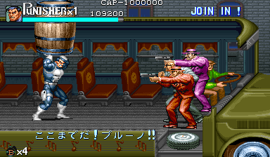 | 戦い終わって…… 死闘の末、用心棒のスカリーを叩きのめしたパニッシャー達。ブルーノのアジトを聞き出すべく銃で脅すパニッシャー(ニックは普通に襟首を掴むだけ)。 「さァ、ブルーノのアジトをいえ!」 「いう、いうから殺すな! フロリダのパンタベルテ城だ!」 「そうか、ありがとうよ!」 自分にたてついた悪党を生かして帰すほど人道的な性格をしていないパニッシャーは、躊躇うこともなく、スカリーのアゴ先に突きつけていた愛銃のトリガーを引く……! 悪党共は全て地獄に堕ちろ! それがパニッシャーの正義なのだッ! *ニックは聞き出した後、サマーを一発決めて眠らせるだけです。 |