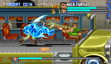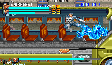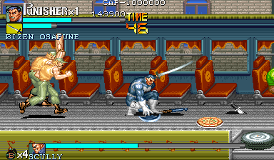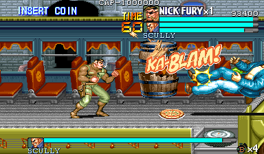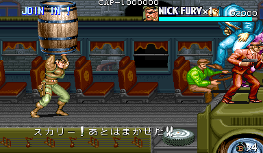 | ニック限定攻略(海外版共通) パニッシャーと違い、横方向に強力無比な攻撃判定を持つ波動サマーを使って戦います。 開幕で樽を投げつけた後、跳び蹴りや流星キックでスカリーを転倒させ、肉薄した後は倒れたスカリーを持ち上げ(もしくは掴んで)左側に投げ飛ばします。 あとは左側から来襲してくるスカリーやザコを確認して、サマーで撃墜します。 一応、サマー>サマーの間にスキがあるので、ちゃんと見てから迎撃した方が安全ですが、適当に乱発しているだけでも何とかなる場合が多いです。 勿論、肉薄されたり近接で殴られた場合などは、必殺技で吹っ飛ばして仕切直ししましょう。 |