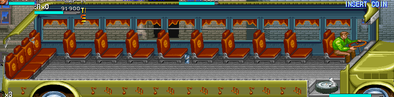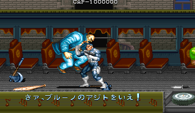 ひたすら流星キックをたたき込めッ! 樽を命中させてひるんだスカリーに向けて、あとはひたすら流星キックを叩き込みます。このエリアは上下幅が異常に狭く(横幅も大して広くないです)、軽妙に移動しながらの立ち振る舞いというのがかなり制限されます。 その為、敵を転倒させてから一旦距離を置いて……という余裕のある立ち回りは一切できません。 とにかくスカリーの起きあがりにタイミングを合わせてひたすら流星キックを浴びせましょう。 また、スカリーの体力減にあわせるかたちで、 ザコ3人>ナイフ持ち&ザコ>斧持ち&日本刀持ちザコ>バット持ちザコ2人>手榴弾持ちザコ(こいつは必ず殺して手榴弾を奪取すること) と、順番にザコキャラが出現しますが、彼らが出現しだしたあたりから、左右へとリズミカルに流星キックをくり返して強引に両方向に押し込むように戦うと良いでしょう。 海外版の場合は通常のダッシュジャンプキックになる為判定も弱く、スカリーも完全に転倒してくれないので、1面ボスとの戦いがいきなり修羅場となります。最悪、慣れない内は手榴弾をある程度連発してもかまわないと思います。 |