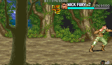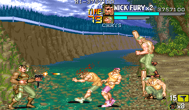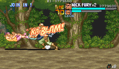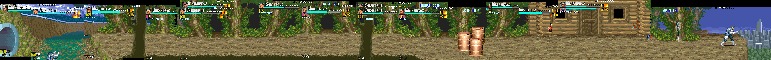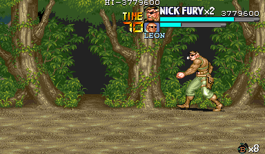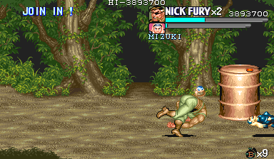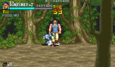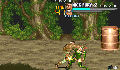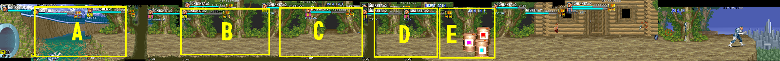 Eポイント:肉の入ったドラム缶を死守せよ! Dポイントで最後の体力回復を終えると、ボス前最後の難関であるくのいち3人との闘いが待っています。 少しスクロールさせるとドラム缶が3つ並んでいますので、闘いの邪魔にならないように下2つは破壊しておきます。 カンスト狙いの場合は、ちゃんと持ち上げてから破壊しましょう。ただし、持ち上げるためにスクロールさせると、くのいち達が出現しますので、その後の行動は迅速に行って下さい。 アイテムを持ち上げて得ることのできる点数の方(25個目以降は8100点)が、サマーや流星キックで破壊した点を上回るので、点数狙いの時はそちらを優先した方がいいです。 |