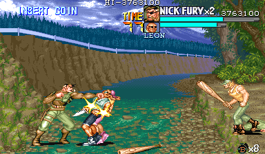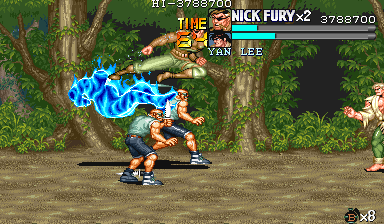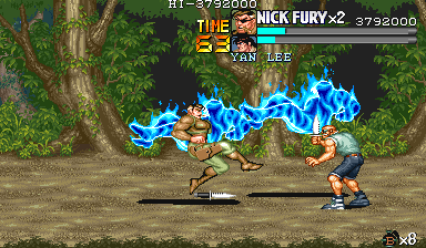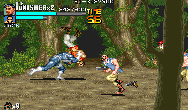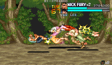 | ナイフザコ3人で、このポイントの敵は出尽くしたことになります。後は敵を片方にまとめることに注力しながら戦うようにしてください。 このポイントは足をうまく使う空手家やナイフザコと戦うことになりますので、常に後ろを取られる危険性があります。流星キックなどの攻撃判定が強く、押し込みやすい技を駆使して敵に挟み撃ちにされるシチュエーションを極力作らないように注意して戦ってください。 |