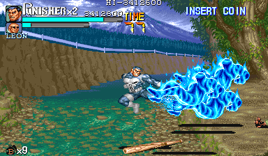 | ヤン・リーを放置したら、敵に左右から挟み撃ちにされる危険があります。そこでヤン・リーをうまくつかみ、左側に投げ飛ばします。 ヤン・リーは受け身を取る危険性があるので(受け身を取ってもぶつかった敵は吹っ飛びます)、状況によってはつかみからサマーなどに切り替えてもよいでしょう。パニッシャーはサマーのリーチが短いので、投げの方が安全です。 |