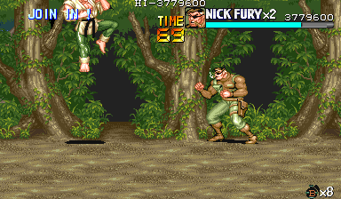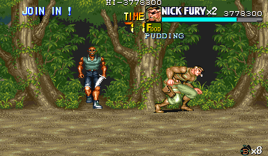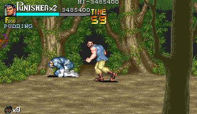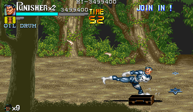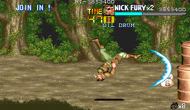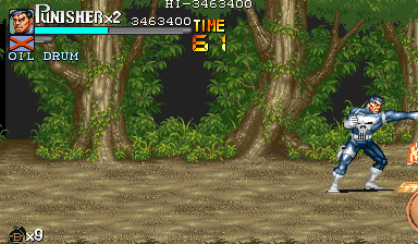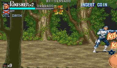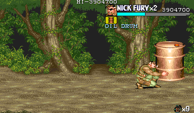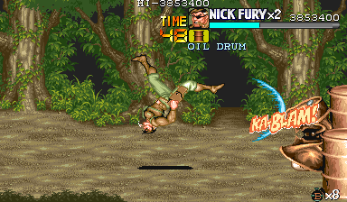 | Dポイント:食料を逃さないように このポイントでは戦闘は一切ありません。ドラム缶が2回転がってくるだけです。 Cポイントを抜けて、スクロールがストップしたら先ほどと同じように画面右上付近でパンチ連打>ドラム缶2個破壊>ダッシュ攻撃で3個目破壊という行程で最初のドラム缶3個を破壊します。 |