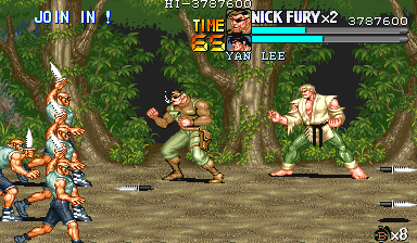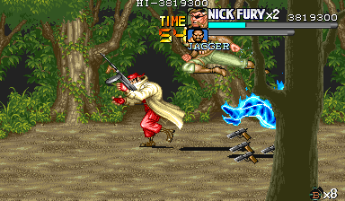 | 次に画面左端からナイフ投げスタイルのナイフザコが3人現れます。画面上部に位置しながら飛んでくるナイフをパンチ連打で迎撃しつつ対処しましょう。 ナイフザコはナイフを投げ終わると1人を残して逃亡します。 |