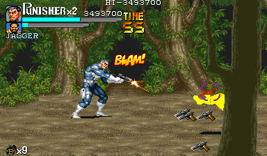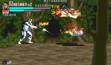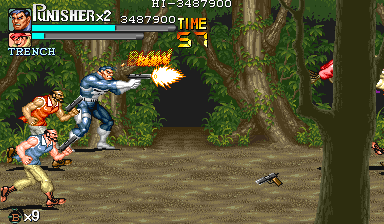 壁際に立ったら、後は右を向きながら銃を乱射して下さい。 勿論、敵の銃弾が飛んできた時には必殺技や上下のダッシュ移動で回避します。 回避した後は再び定位置(左上)に戻って敵を射殺してやりましょう。 途中で右端から拳銃ザコ1人とトレンチ1人が追加されますが、気にせず撃ちまくって下さい(横並びされたら上下に逃げるのを忘れないようにしましょう)。 |
