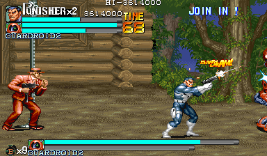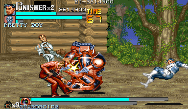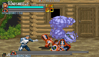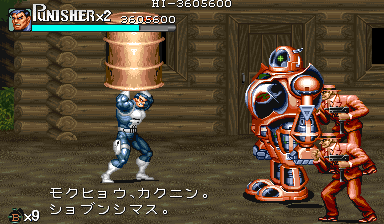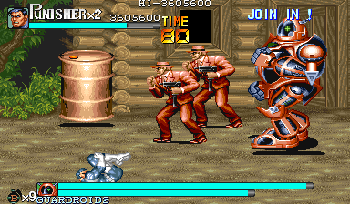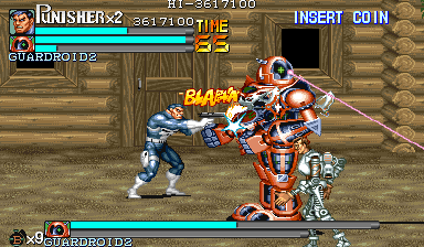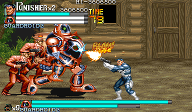 Aポイント:ガードロイド2、出現! 隠れ家を襲撃してきた敵を何とか撃退したパニッシャー一行の前に現れたのは、赤い殺人機械「ガードロイド2」だった! 「モクヒョウ、カクニン。ショブンシマス」 機械人形の口から漏れた無機質な処刑宣告。 舐めるんじゃねぇ! スクラップになるのはテメェの方だ! 狂気の殺人機械と処刑人とのバトルが今、始まる。 |