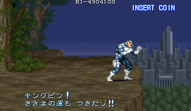 最後の標的は……? 苦闘の末、ガードロイド2をスクラップにしたパニッシャー(ニック)。 彼らの眼前に広がったのは、都市の中央に位置する巨大なビル……そこにキングピンが隠れているらしい。 「キングピン! きさまの運も つきたゾ!!」 「そろそろケリをつけるか。 ゆっくりタバコもすえやしねエ!」 最後の標的、キングピンに照準を絞ったパニッシャー(ニック)。2人はついに、最終決戦場へと向かうことを決意したのであった……。 |