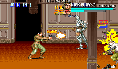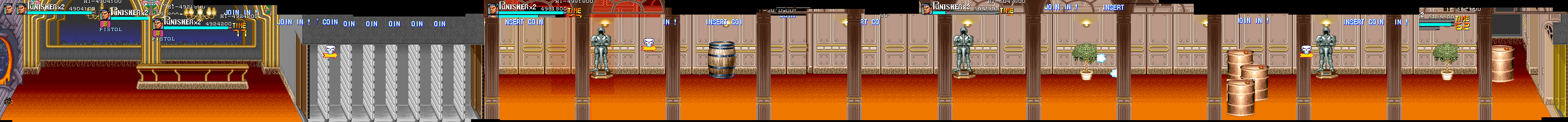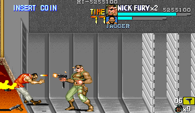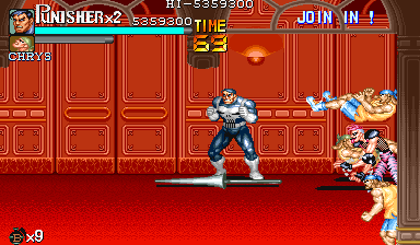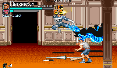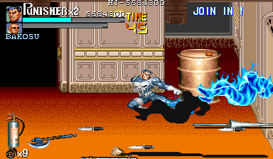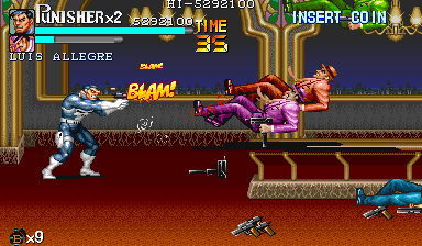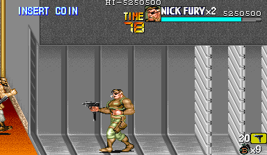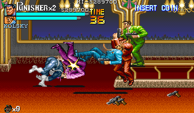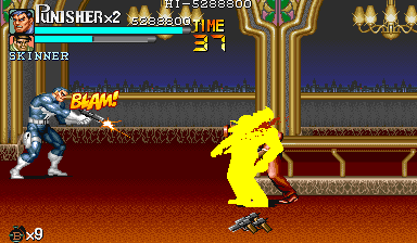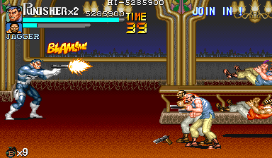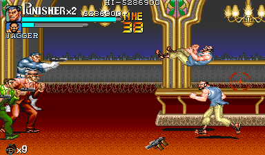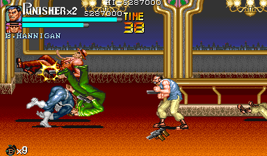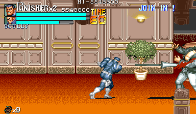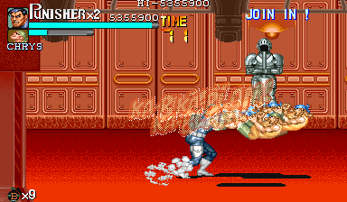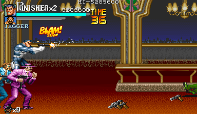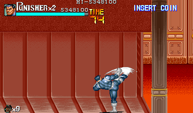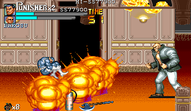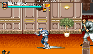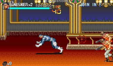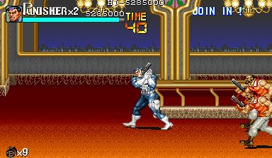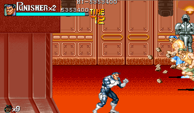 Aポイント:左上を軸に戦え! キングビルに風穴を開けて、颯爽と登場したパニッシャー一行。少しスクロールすると、おなじみの拳銃ザコ達4人が出迎えてくれます。 そこで一端拳銃ザコが現れたら画面左上に向けてダッシュします。 |