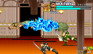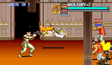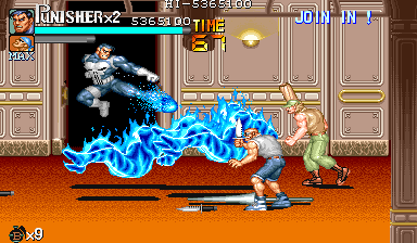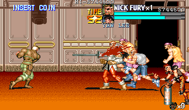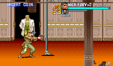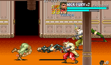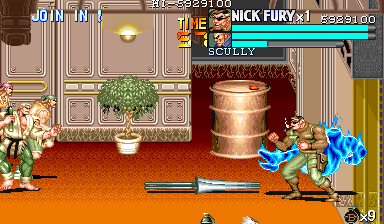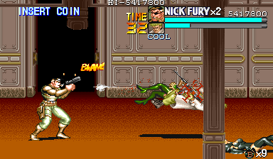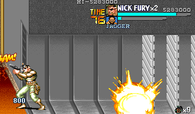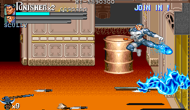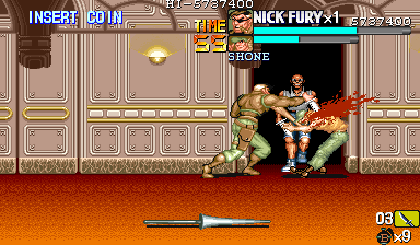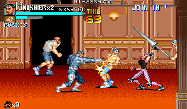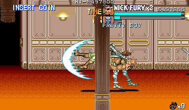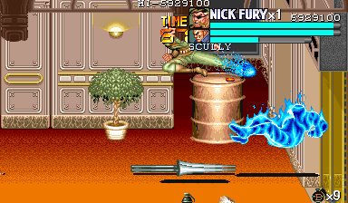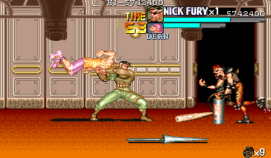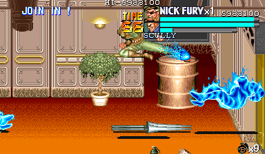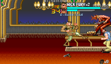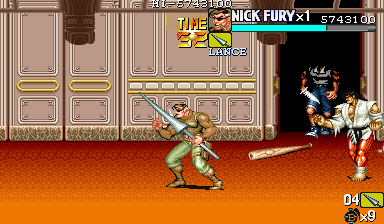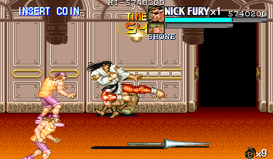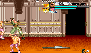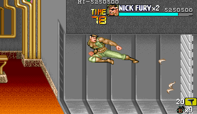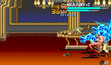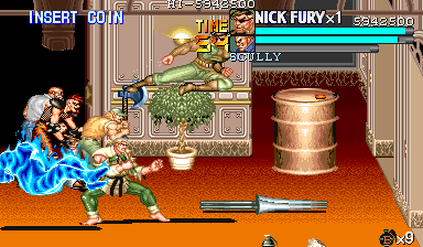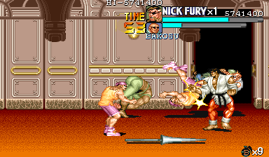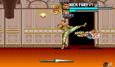 | ザコをある程度処刑したら、最後はスカリー共々残りのザコを画面端に追いつめて流星キック乱打でトドメをさします。 別に点数狙いでなければ投げ技でも何でもOKです。 |