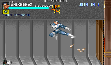 | Bポイント:手榴弾を確実に手に入れろ! 拳銃ザコ共を撃破したパニッシャー一行が先に進もうとすると、幾重にも重なったシャッターに守られた扉が。ここは一気にシャッターをぶち破ってスペースを作った方が楽なので、流星キックではなく通常のダッシュジャンプキックを使って破壊すると良いです。 ジャンプ頂点付近で攻撃ボタンを押すといつも通り流星キックになってしまうので、ジャンプした瞬間に攻撃ボタンを押すといいでしょう。 |