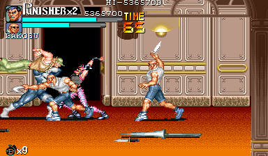 続いて右側から通常ザコとパンクザコが現れます。いつものことですが、パンクザコの挙動には注意しましょう。いつ地面に落ちている武器を拾っているか、乱戦時には分かりづらいので。 |