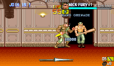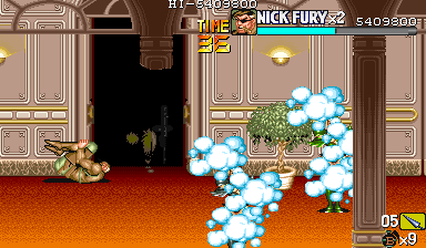 | 危険を感じた時は即手榴弾か必殺技で対応しましょう。 特にザコが画面全体に散らばった時などは、ためらわずに使うようにしましょう(ここの右端にある柱の中には手榴弾があるので、最悪補給もできます)。 手榴弾をうまく使うことでザコを片方にまとめたり、一気に殲滅することもできます。 とにかく、殺される前に手榴弾を使い切るのがこのゲームの基本スタイルなので、手榴弾を抱えたままで死ぬという最悪な流れにだけはならないように注意してください。 |