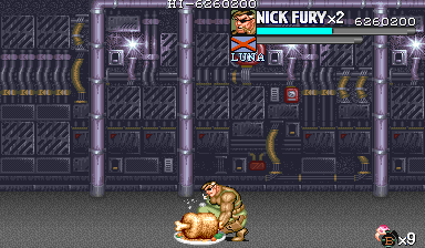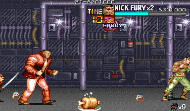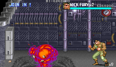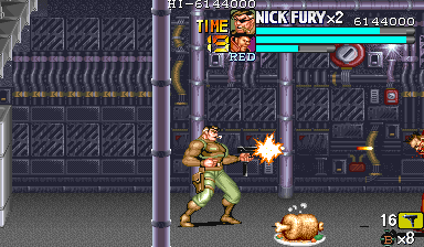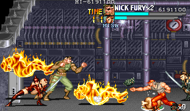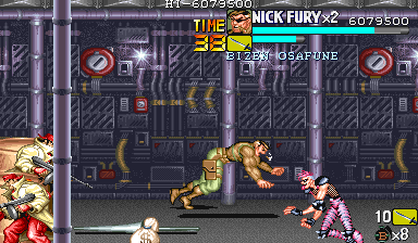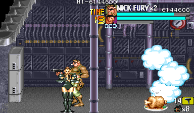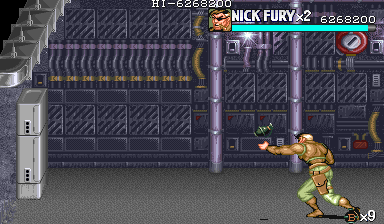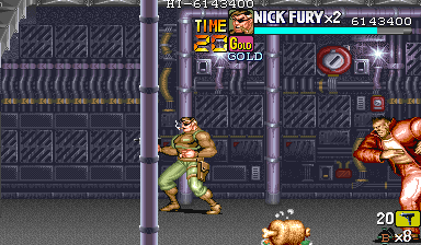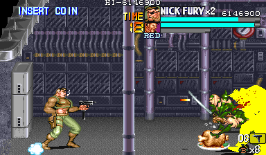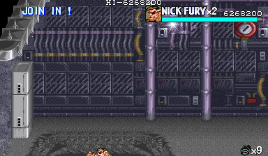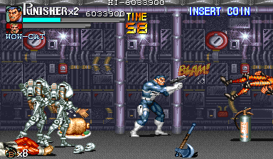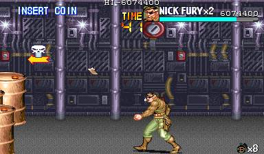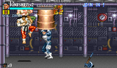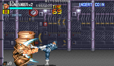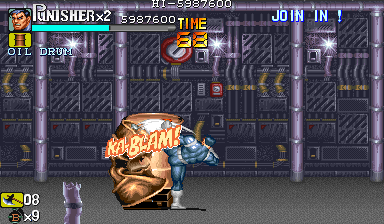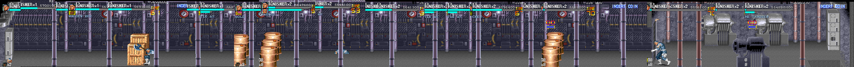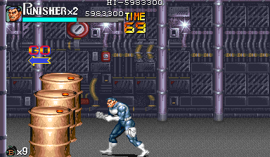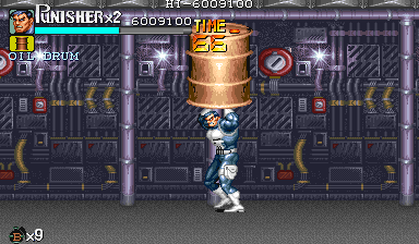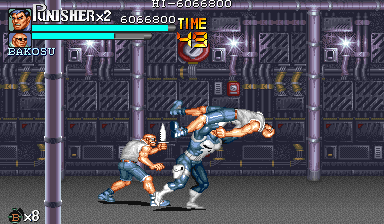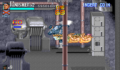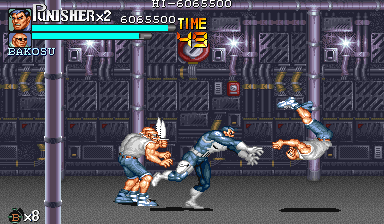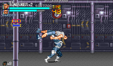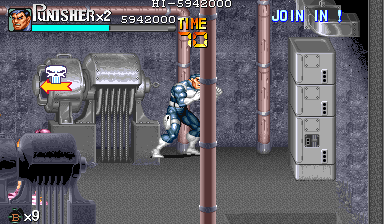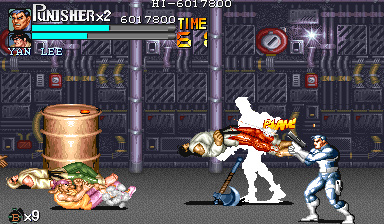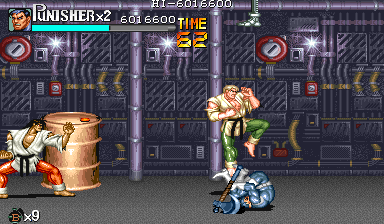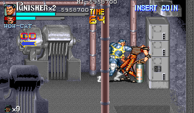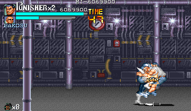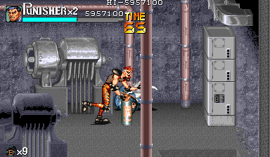 Aポイント:壁際でパンチ連打するだけ エレベータの天井裏でジグソーを撃破し、機械室へと抜け出たパニッシャー一行。 ここでは通常ザコと火炎放射器装備のパンクザコが待ち受けていました。 |