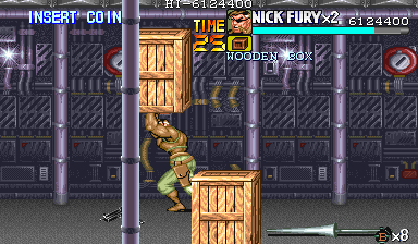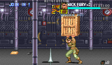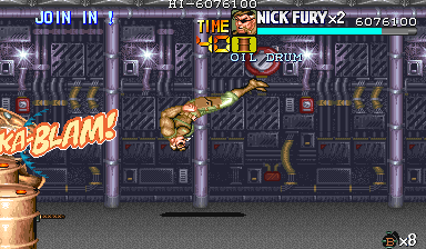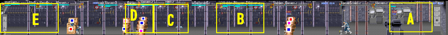 | このポイントでは、更に左側の画面外にドラム缶が2つ、計5つのドラム缶が並んでいるのですが、これ以上先に進むと敵が一斉に登場してしまいます。そこで、ここはカンスト狙いのプレイヤーでも、先にドラム缶を破壊しておきましょう(カンスト狙いなら、当然サマーの先端で)。勿論、カンスト狙いでなければ、こんなことは気にせずに、ドラム缶を無視して先に進んで敵と戦闘に入っても問題ありません。 このポイントのドラム缶の持ち上げ回数を無視したとしても、ここ以外に設置されているアイテムやオブジェクトを出来る限り完璧に持ち上げたり手に入れてさえいれば、ほぼ完璧に99個アイテム入手ボーナスを手に入れることができます(いい加減にやっていたら無理)。 このポイントは、敵が出始めたら乱戦になり、そうなるとオブジェクトの持ち上げはおろか、破壊点まで敵に取られかねません。そのため、先に取れる点数を取っておいた方が効率は良いということになります。覚えておきましょう。 |