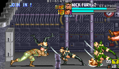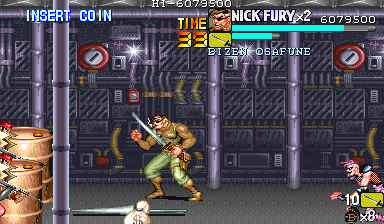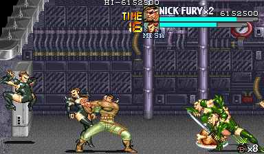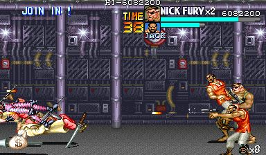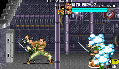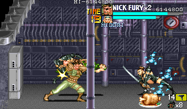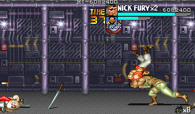 本来ならば、左側に敵が集中しているので、そのままボコボコにしてやればいいところなのですが、ここはあえて1人ずつ右側へと投げて、画面外に追いつめてからボコボコにしてやります。 なぜ、そのようなことをするかといいますと、このエリアは左側へと進む構成となっているため、敵を左側に置いた状態では、プレイヤーは画面中央から左へと進むことが困難になります(スクロールするから)。 となると画面中央よりも常に右側で戦うことになるのですが、知ってのとおりナイフザコ達はナイフ投げやダッシュ斬りなどのリーチが長かったり、油断すると喰らってしまういやらしい攻撃を持っています。 彼らがフリーで動けるエリアがある状態で、彼らと戦うのはあまり得策ではありません。そこで、ここはあえて全てのナイフザコを、彼らの機動性が生かせない右側の画面外へと追いやってから始末してやります。 右側へと投げるのは、連続技からのリフトスルーを使います。投げモーションは無敵ですし、そこから打撃へとシームレスに移行すれば、残るナイフザコから攻撃を受ける心配は少なくなります。 |