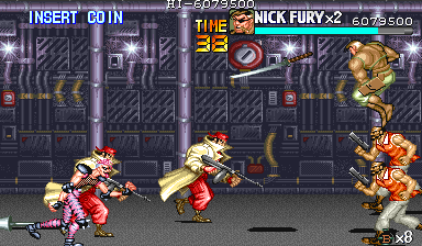| ある程度頭数が減ってきたら、右側から火炎放射器装備のパンクザコが出現します。こいつはその時々のシチュエーションに合わせて処理を変えます。 まず、自分が画面左側によっていた場合は右にスペースがあるので、振り向きつつ銃弾をぶちこんで速やかに射殺します。当然背後にいるプリティーボーイや空手家たちには注意してください。 |