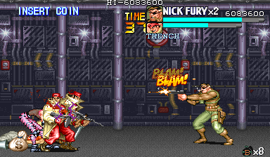 | さて、ドラム缶を破壊して、少し先に進むと、左側からトレンチが2人、右側からパンクザコが登場します。 | ![]() |