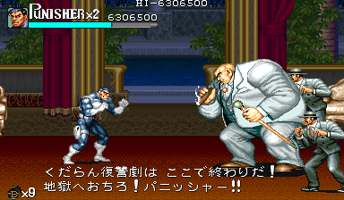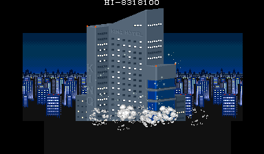 崩壊するキングビル。パニッシャーの復讐劇はこうして終わりました。 最後に今まで処刑した人数が公表され、スタッフロール(1コイン時とコンティニュー時で違いあり)が流れてゲームは終了します。 最初は大変だと思いますが、ぜひとも1コインクリアのスタッフロールを見れるよう頑張ってください。 |
