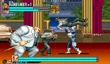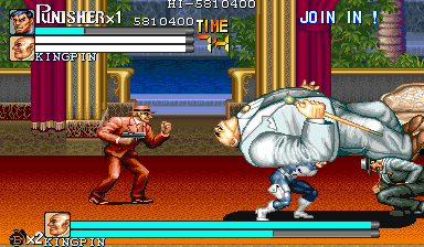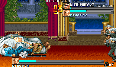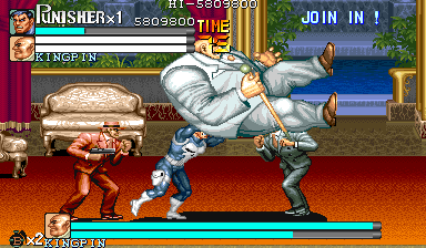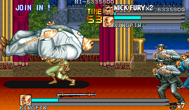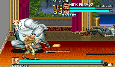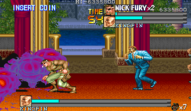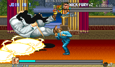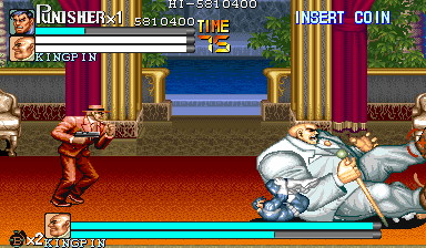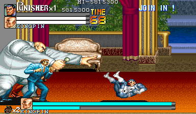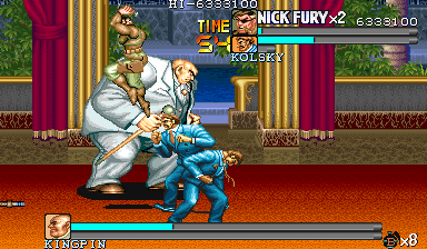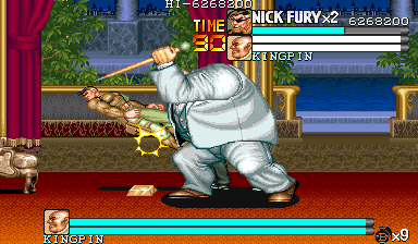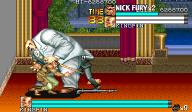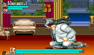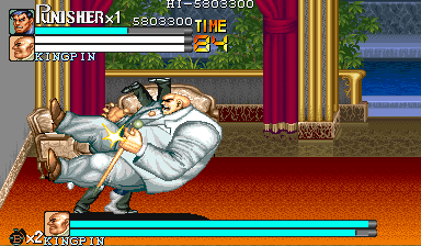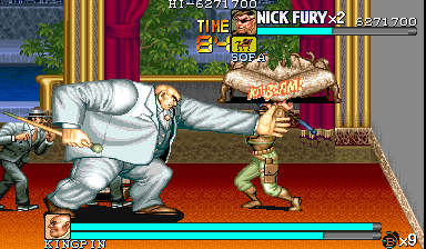 | 不用意にキングピンに近づくと、その大きな腕にとらえられ、ゴミクズのように放り投げられます。 キングピンがフリーの時に近づくと、高確率で発生。持ち上げられた時に、レバガチャとボタン超連打で脱出は可能です。 これ以外にも、葉巻を吸って放たれる殺人スモークガスという凶悪な攻撃を持っています。 |