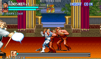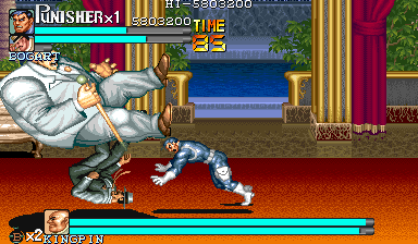 後はひたすら(持ち上げ>投げ>ダッシュ)×∞の繰り返しです。 注意する点は、画面端に投げつけるとキングピンはぶっ倒れることなく、即復帰するので左右に投げ位置を調整することと、ザコの動きに気を配ることです。 |