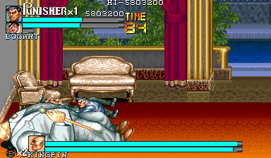| 写真の場合、プレイヤーは左を向いているので、手榴弾に巻き込まれたキングピンやザコたちは、全て左側に吹き飛びます。 ここで1つ注意点ですが、画面左端にいる場合は絶対に右を向いて手榴弾をぶっ放してください。でないと壁際に吹っ飛んだキングピンは即復帰するので、手榴弾の出し損になります。 |