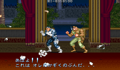 後は投げからの無限ループ開始です。ザコを巻き込んだ場合は、そのザコの状態(位置)によってはその1のパターンに移行する場合もありますが、基本的にはキングピンをハメるという方向性には何もかわりはありません。 |